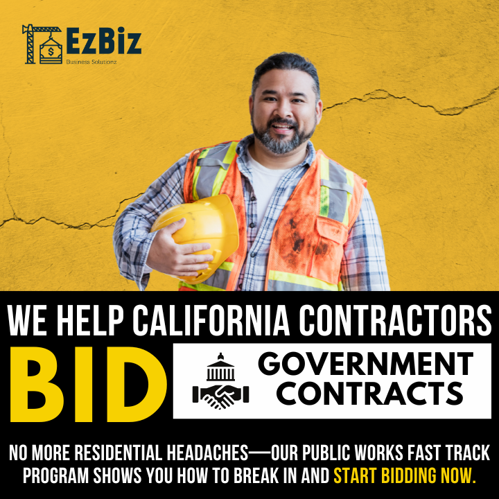 In addition to our Done-for-You services, we also offer EZ Trainings designed specifically for California contractors. We teach you exactly how to enter the Government and Public Works sector—what you need to start bidding, where to find the best leads, how to prepare a winning bid package, and how to stay compliant every step of the way. The benefit? Better projects, better profits, and a business built to last.