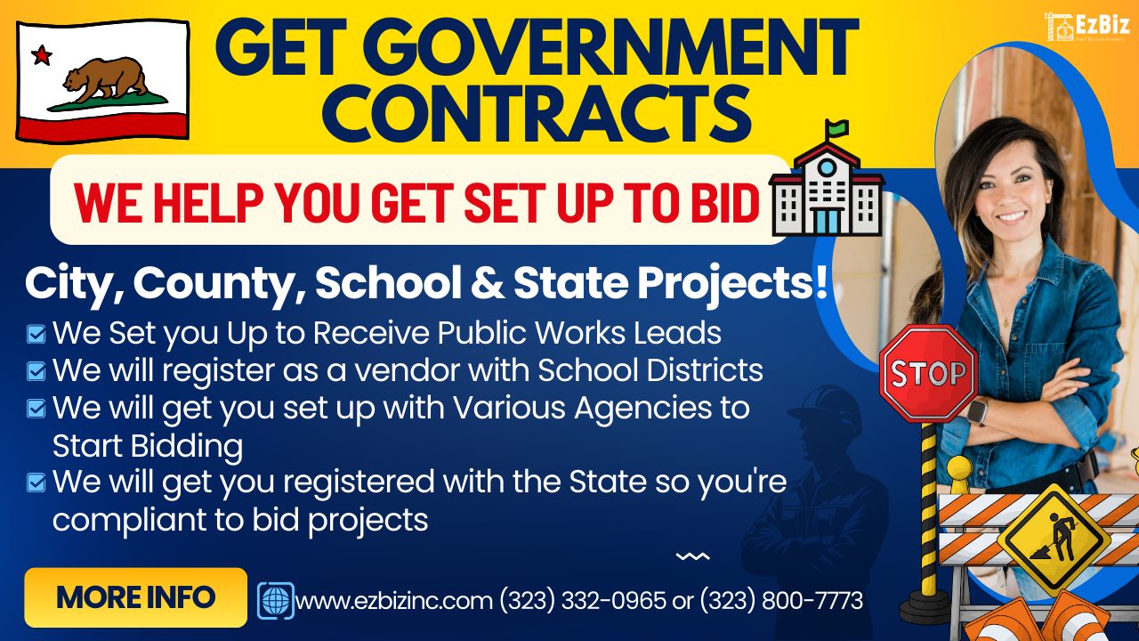 We help California Contractors BID Government Contracts. No more residential headaches—our Public Works Fast Track Program shows you how to break in and start bidding in as little as 45 days.